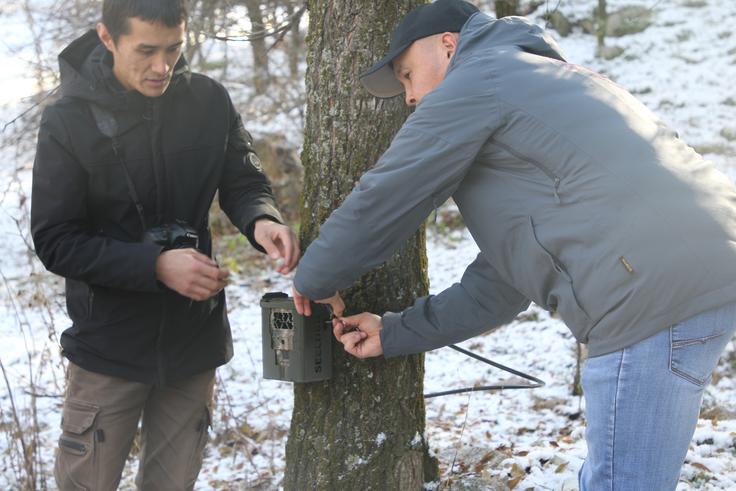 Seminar participants setting up a trail camera, Almaty, 14 November 2019.
