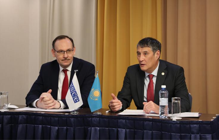 Volker Frobarth, Head of the OSCE Programme Office in Nur-Sultan, and Colonel Askat Sadykulov, Deputy Director of the Border Service of the Committee for National Security, spoke at the Ceremony dedicated to transferring devices for verifying travel document authenticity to the Border Service, Nur-Sultan, 13 December 2021