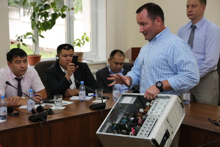 Эксперт по борьбе с киберпреступностью из США объясняет, какие главные компоненты компьютера могут содержать электронные доказательства во время изъятия на месте преступления, Алматы, 15 июня 2015.