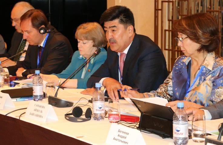Ерлан Нысанбаев, Вице-министр сельского хозяйства Казахстана, выступает с приветственной речью на национальной подготовительной встрече высокого уровня по управлению водными ресурсами, организованной Офисом программ ОБСЕ в Астане совместно с Посольством Швейцарии, Астана, 2 июля 2015 года.