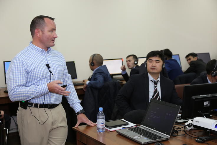 An expert on countering cybercrime from the United States makes an introduction to the Computer and Network Intrusion Course to the group of Kazakhstan's officials, 19 October 2015.