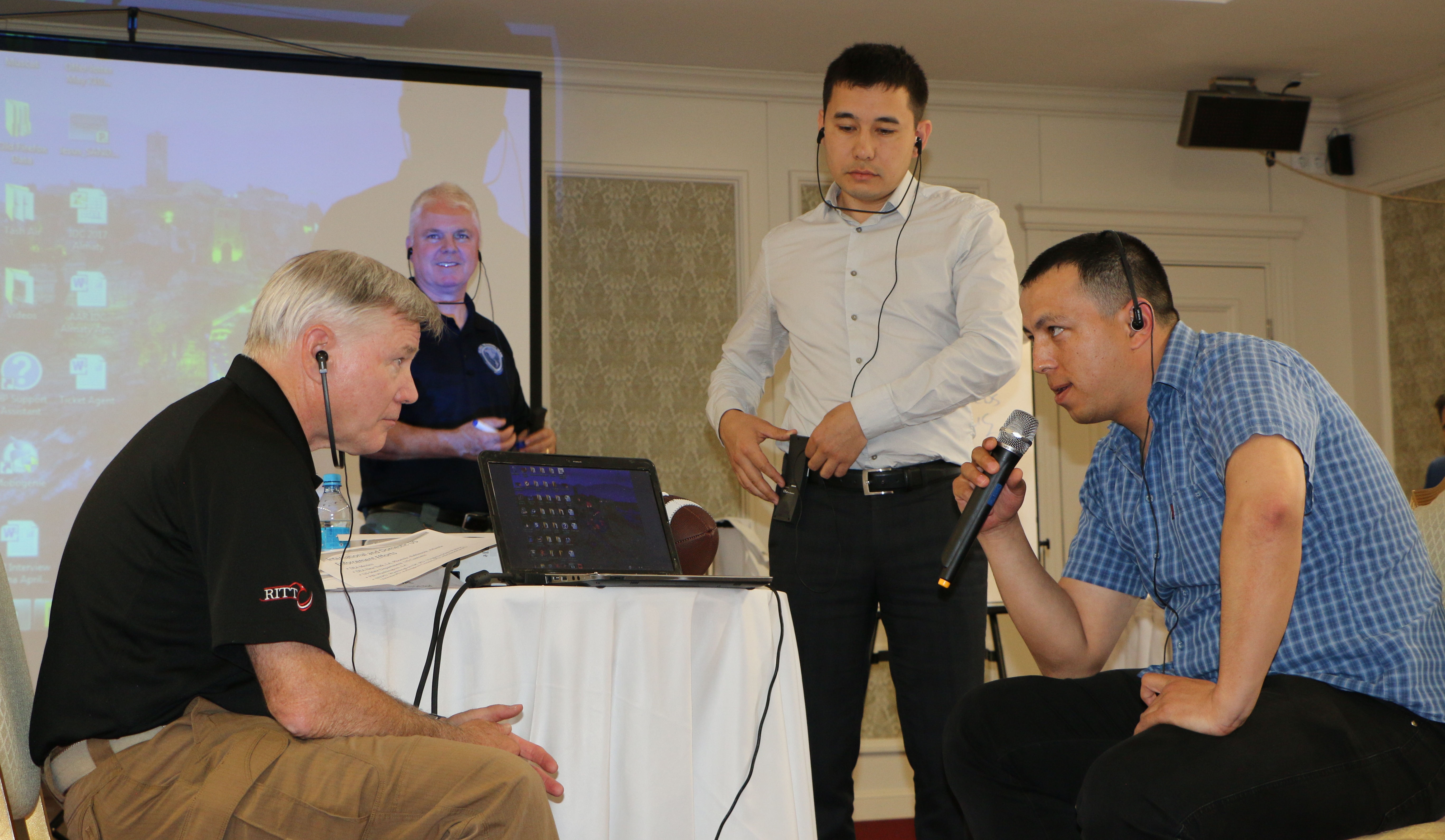 Participants of the course are using their newly acquired skills in interviewing with a potential smuggler of drugs in a simulated situation, Astana, 27 April 2017.