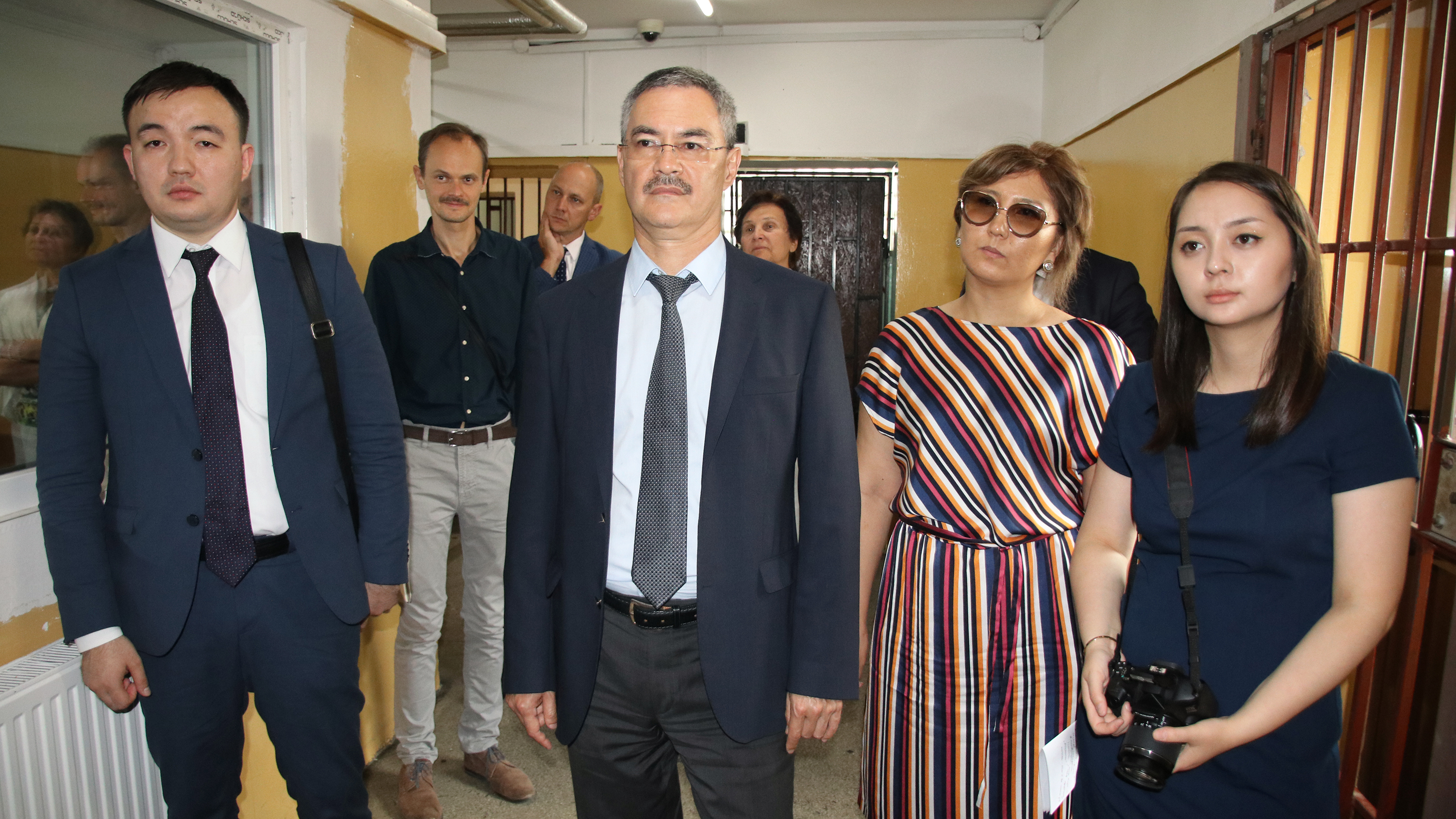 Глава Национального центра по правам человека Серик Оспанов (в центре) в ходе мониторингового визита в следственный изолятор в Варшавe-Бялоленке, 10 Августа 2018.