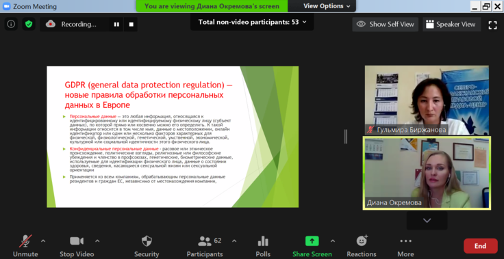 Эксперты ОБСЕ Диана Медведникова и Гульмира Биржанова делают презентацию по защите частной жизни и персональным данным, 20 августа 2020 года.
