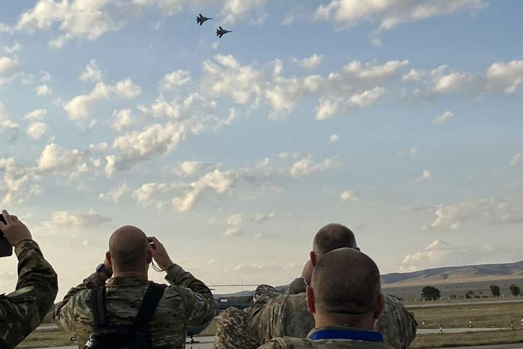 Военные эксперты на практической воздушной эксплуатации истребительной авиации во время посещения 604-й авиабазы в Талдыкоргане, 3 октября 2023 года.
